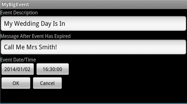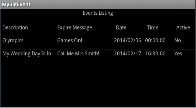 A long-touch on the Event Maintenance item will bring up options to either Edit or Delete specific Events. The Description is what is displayed while counting down to the Big Event. The "After Expire" message is to let you know that it is finally here and you made it!