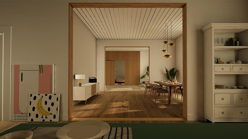 Free interactive first-person walkthrough of a home interior. With the possibility of changing materials in some pieces of furniture, decoration and flooring.