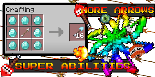 An excellent opportunity to upgrade your hero. Your arsenal will be replenished with powerful weapons that endow the owner with superpowers. Craft new arrows that, after hitting the target, will lift the enemy into the sky and make him weightless and send him into space. You will also get the ability in one click, by charging your bow, to destroy a house or even an entire settlement, because your arrow is no longer just made of wood and iron, you need a TNT block to craft it. Your inventory will also contain dangerous items that can cause lightning and other natural disasters. Now, having gone to the lower world, you can kill the ender dragon and other monsters because your weapon has a lot of damage from a distance. Having a bow with arrows like this won't scare you at night. The tests will be not only in survival but also in crafting, because special arrows need to be crafted with the help of potions that give them luck or other effects. If you like to shoot from a bow then you can transform into a superhero green arrow. The arrows of course will not automatically aim at the target, but they will be able to slow down, apply poison to the enemy and even lift him up. The mod is perfect for both adults and children because you can expand the possibilities of the classic game and conquer the online world. Get a great bonus in competition with friends and just in survival. You will have magic weapons for battle royals in your inventory. On any map, you will have no equal in hunting or simply looking for adventure.