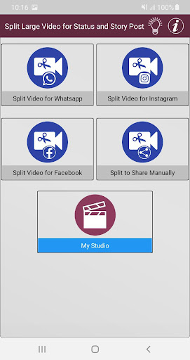 This free App helps you to Split your Large video according to your choice of Social media App and share the video slices in just single Tap. App comes preloaded with settings of Status sizes of Whatsapp Facebook and Instagram Stories.