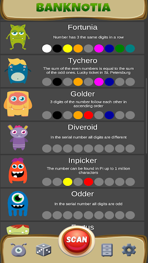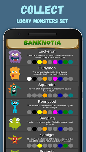 👾 Every criterion of luck looks like a cute monster. It's a Luckymon (lucky monster). If it lives in your bill, it means it's lucky. There are 288 kinds of monsters in the mobile app.