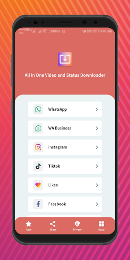 All in one Video And Status Downloader app will help you to download any videos, status and images from Facebook, Instagram, Twitter, Whatsapp,Likee and Tiktok. You can also share the media that you downloaded to any app.