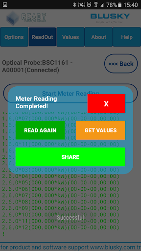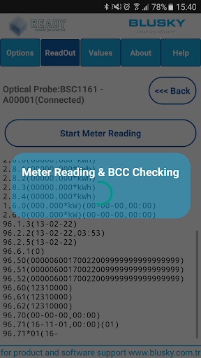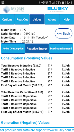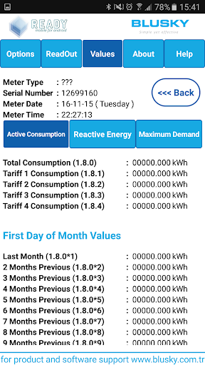 With the free Ready Mobile for Android Free Beta, you can read ReadOut values from smart electricity meters that support the IEC 62056-21 standard, as well as more advanced software versions for load profiles and event logs. Detailed information is available at www.blusky.com.tr.