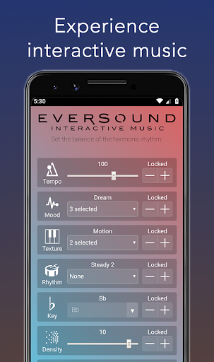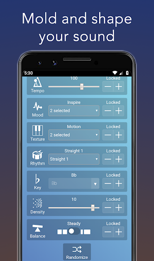 Design and discover the perfect musical settings for your background music. You set the mood, texture, key and tempo and your device will endlessly generate music according to your settings.