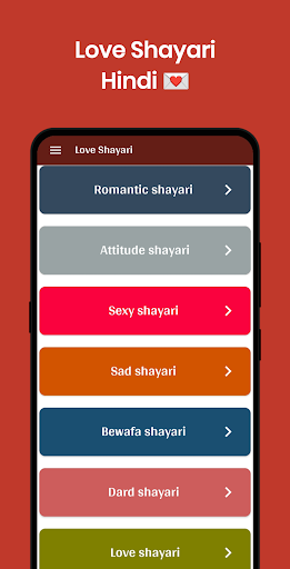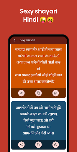 This app brings you the best collection of रोमांटिक शायरी - Sexy शायरी and SMS in Hindi for 2023. This app is for all the Sexy , रोमांटिक शायरी lovers who want to express their Romantic and Love through sms or status. Express your Sachi Mohabbat with these Sexy , रोमांटिक शायरी. 😔 These Sexy , रोमांटिक शायरी hindi shayari can be sent as an SMS to mobile or as WhatsApp message.