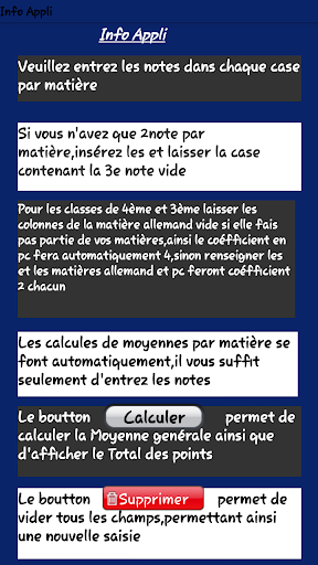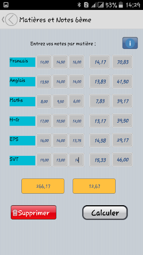 Appli permettant de calculer les moyennes automatiquement par matière et ainsi que la moyenne générale.il suffit d'entrer les notes et les moyennes des matières se calculent automatiquement affichant ainsi la note pondérée de la matière...Après toutes les saisies la moyenne générale est calculée par le bouton "calcul" affichant aussi le total des points
