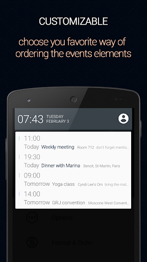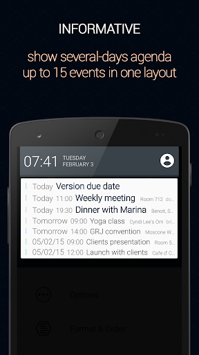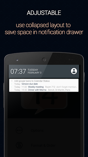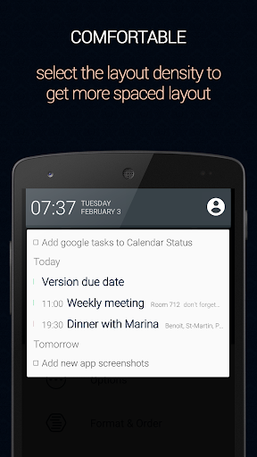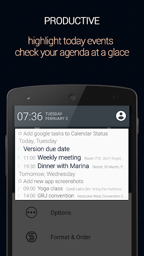 Calendar status places your agenda on your notification drawer, providing easy and quick access to your agenda from any app and any screen.