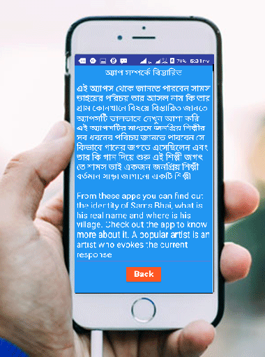 এই অ্যাপস থেকে জানতে পারবেন সামস ভাইয়ের পরিচয় তার আসল নাম কি তার গ্রাম কোনখানে বিষয়ে বিস্তারিত জানতে অ্যাপসটি ভালভাবে দেখুন আশা করি এই অ্যাপসটির মাধ্যমে জনপ্রিয় শিল্পীর সব ধরনের পরিচয় জানতে পারবেন সে কিভাবে গানের জগতে এসেছিলেন এবং তার কি গান দিয়ে শুরু এই শিল্পী জগৎ তে শামস ভাই একজন জনপ্রিয় শিল্পী বর্তমান সাড়া জাগানো একটি শিল্পী