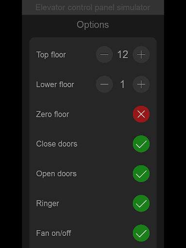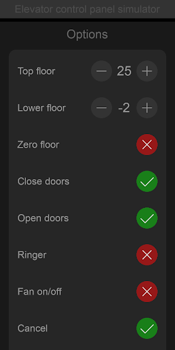 - Service buttons: open door, close door, cancel, ringer, fan