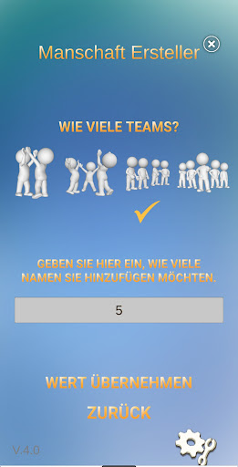 (Create up to 5 random teams with up to 20 random players. Enter the number of teams and the number of names. Enter the names in the next menu. Then the names are distributed into random teams. You can mix again if you didn't like it.)