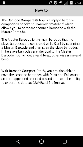The Barcode Compare © App is simply a barcode comparison checker or barcode “matcher” which allows you to compare scanned barcodes with the Master Barcode.
