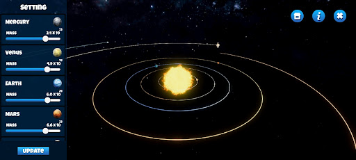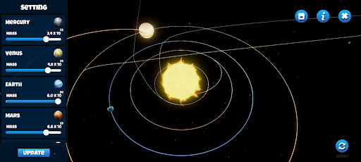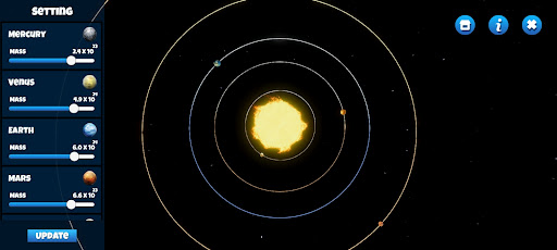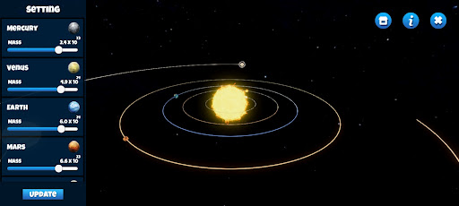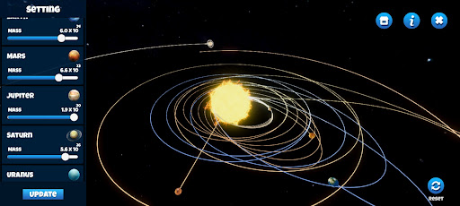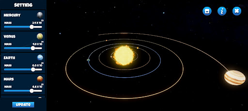 In this application you can change the mass of any Planet, to observe that how variation in the mass of one Planet will effect the motion of other planets, and how the orbits of planets shifts.