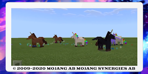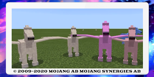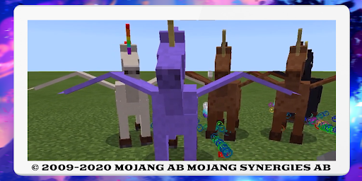 The magical horse mod will not only add fabulous guests - animals, but also faithful mounts from fairy tales. Populate your house with colorful horse friends. Some of them are simple fast horses, they are suitable for high-speed races, and some are unique and have wings, but only they are still wild and unbridled, it is impossible to conquer them. Winged unicorns in different colors will completely complement your cool planet. All creatures from this add-on are harmless and friendly. Prepare your pet for a dangerous world! Create armor on the crafting table and protect against attacks from the creeper, enderman, and other hostile mobs.