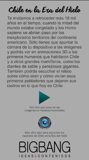 Te invitamos a retroceder más 18 mil años en el tiempo, cuando la mitad del mundo estaba congelado y los Homo sapiens se abrían paso por los inexplorados territorios del continente americano. Sólo tienes que apuntar la cámara de tu dispositivo a las imágenes y podrás ver en animaciones 3D a los primeros humanos que habitaron Chile y a otros grandes mamíferos, como los dientes de sable y perezosos gigantes.