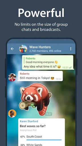✔ You can create group chats for up to 200,000 members, share large videos, documents of any type (.DOC, .MP3, .ZIP, etc.), and even set up bots for specific tasks. It's the perfect tool for hosting online communities and coordinating teamwork.