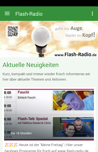 Flash-Radio gibt es jetzt als native App fürs Smartphone! Immer auf dem aktuellen Stand bleiben und keine Neuigkeiten mehr verpassen. Immer auf dem Laufenden durch Push-Benachrichtigungen. Natürlich ist ein Smartphone eben auch ein Telefon, so dass per Knopfdruck eine Verbindung hergestellt werden kann. Diese App ist der direkte Draht zu uns.