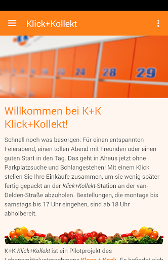 Schnell noch etwas bei K K besorgen? Das geht mit der Klick Kollekt-App jetzt ruckzuck! Mit einem Klick stellen Sie Ihre Einkäufe zusammen, um sie wenig später fertig gepackt an der Klick Kollekt-Station bei K K abzuholen. Nie wieder Parkplatzsuchen, endlose Regalmeter ablaufen und Schlangestehen: Klick Kollekt!