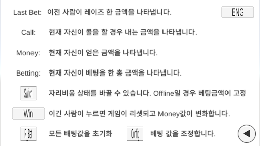 여러 사람들과 포커, 훌라 등 카드게임을 할 때 돈이 왔다갔다 하며 계산을 하는 게 싫거나, 또는 가상의 돈으로 베팅을 하고 싶을 때 이 어플을 사용하세요.