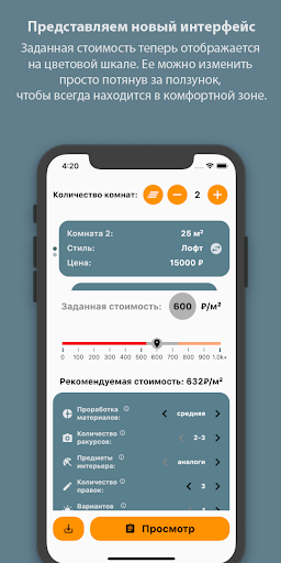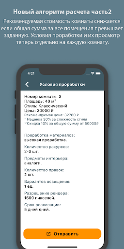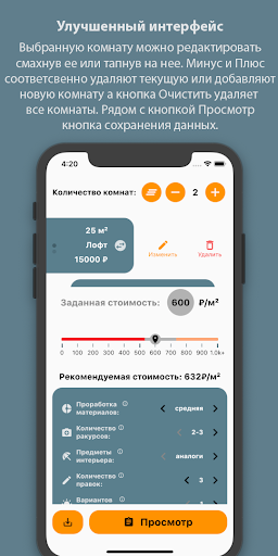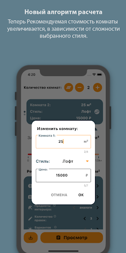 - Ввод данных по текущей квартире (площадь, стиль и цена комнат).