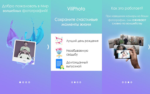 Vili Photo - это приложение с дополненной реальностью, благодаря которому, ваши фотографии оживают словно по волшебству. Достаточно просто навести камеру на фото и оно оживет.