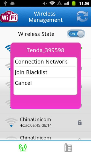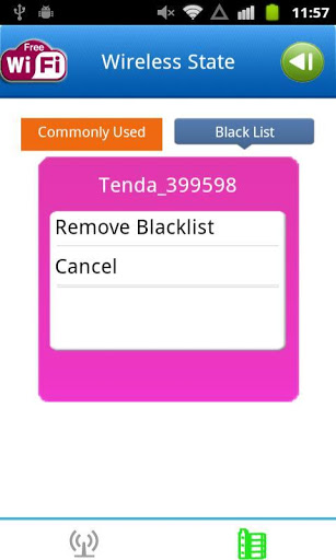 Wireless WiFi Network Software is a software which can connect WiFi network and scan all wifi access point near you! To avoid the WiFi hacker or the damage of WiFi router, this free wifi app allow you add blacklist to realize shield don't want to connect the WIFI signal.3G wifi is common used and even all android phone and tablet can scan and connect with a wifi access point! WiFi make mobile internet more convenient. This WiFi network management not only allow you connect and disconnect some WiFi network but also can add some wifi sites to blacklist and refuse some WIFI signal!FEATURES:Scan wifi wireless internet and show with a list.Connect WiFi by inputting WiFi internet password or connect open WiFi directly!Disconnect your current WiFi internet.Get WiFi details and know the WiFi site better by knowing its MAC Address and single level.Get WiFi internet single strength. The more level the icon be lighted, the more strength the WiFi signal is!Join some WiFi (usually the wifi that easily be hacked or have disturb signals) access point to BLACKLIST.USING WAY:Short press wireless WIFI point to connect or search detail information Long press wireless network to join blacklist or connection network.Click BOOK icon in bottom of home page, you can see all WiFi in blacklist and WiFi that commonly used:- Tap common used you can cancel auto connection or cancel this step.- Tap WiFi in blacklist, you can remove from blacklist or cancel your Tap motion.When you enter a hotel or restaurant, you often ask waiter to get its public WiFi password and then connect them without paying money. But the premise is you can search their WiFi network! Wireless WiFi Network Software can do this work easily and help you refuse some unsafe WiFi internet!Please support us with five stars or send me email to tell me your questions.$$$Free app with icon and notification involved$$$