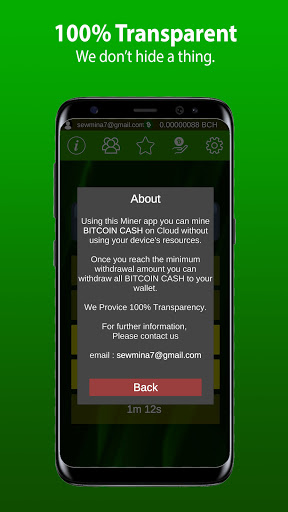 The app is the portal for our Cloud-based BCH Mining servers. You can simply start mining by clicking the button. Once the mining process is completed, you will be notified to start mining again.