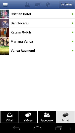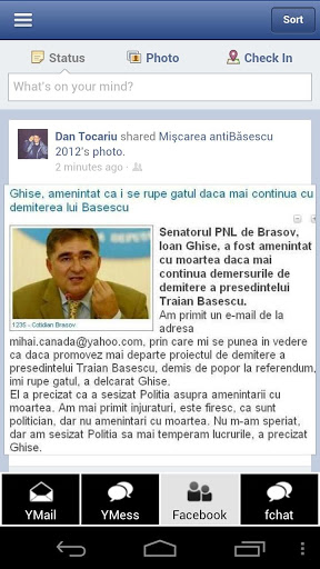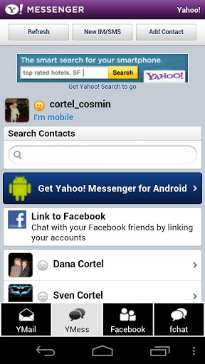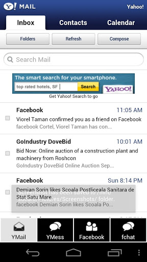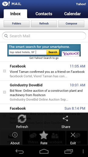 yahoo Mail with Yahoo Messenger and facebook with Facebook chat plus TwitterYahoo and Facebook and Twitter together in one Apps. BestSocial Cloud on Android platform. Contains: Yahoo Mail, Yahoo Messenger, Twitter, Facebook and Facebook Chat. You are in contact with all your friends on Yahoo, Facebook, Twitter all social media Major advantages: Running only one application which means less battery power needed Less CPU consumption Less time to move from one application to another, here are all present in the same social application. One click does check Yahoo Mail, Yahoo Messenger, Twitter, Facebook and Facebook Chat Easy to communicate and much easier to manage your social presence. Installation The first time you launch the application Yahoo and Facebook follow these three steps: You must enter the username and password for the pageYahoo Mail, Facebook profile page and Twitter. Just enter user and password just for these three pages Yahoo Mail YMail Profile Facebook Facebook and Twitter Twitter of the application. We recommend you select to remember your credentials. Then you must exit the application. Launch the application again. Now it will be easier to use Yahoo and Facebook. Refresh button on the menu is that you should use when you communicate through Facebook Chat and Yahoo Messenger or when socializing with friends on Facebook and Twitter.