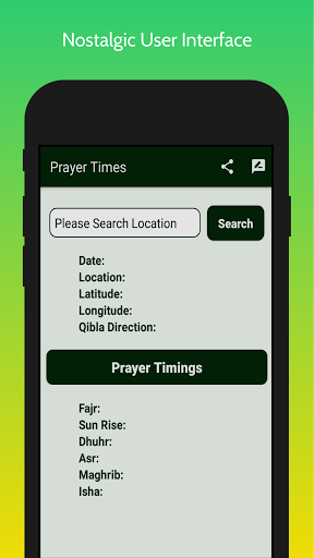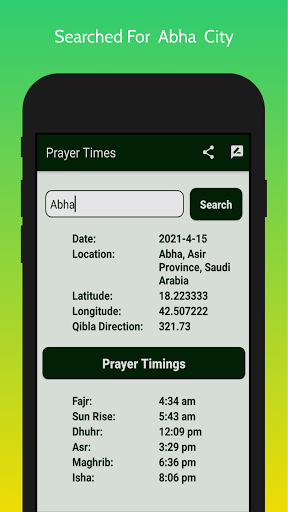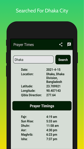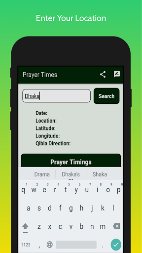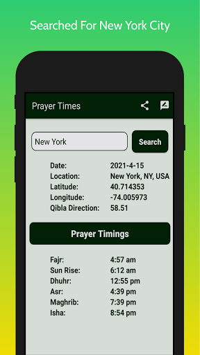 You can get a search option to search anywhere in the world you want. Depending upon your searching location the app will show the exact location you searched for, including Latitude and Longitude of the location. It also shows the Qibla direction of the searched location and Five times prayer time with sunrises timings.