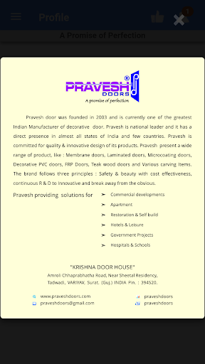 - Pravesh Doors is value driven, technologically advanced & innovation oriented thriving decorative product manufacturing company located at, the fastest growing city of India, Surat.