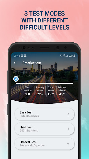 • Mock test: Mock test simulates the real test format. When you finish the test you will see your score and review all the questions.
