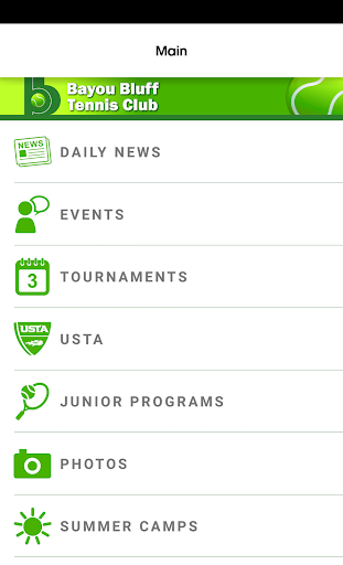 Bayou Bluff Tennis Club app is designed for members, potential members, and tournament players.