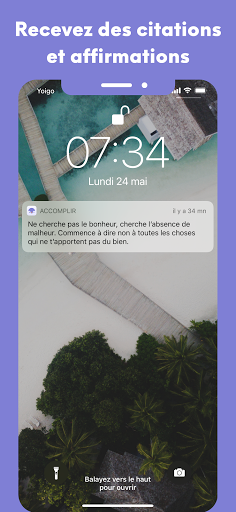 Accomplir App vous envoi de la motivation tout au long de votre journée, à travers des pensées et citations positives, ainsi que des affirmations quotidiennes qui vous aideront à renforcer votre confiance en soi.