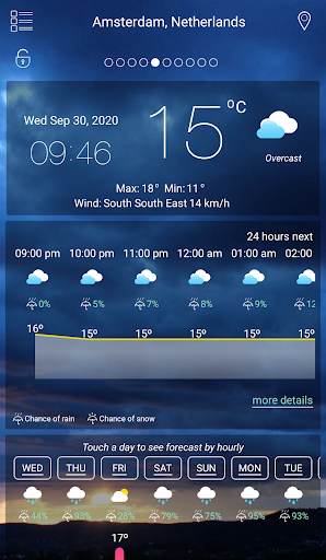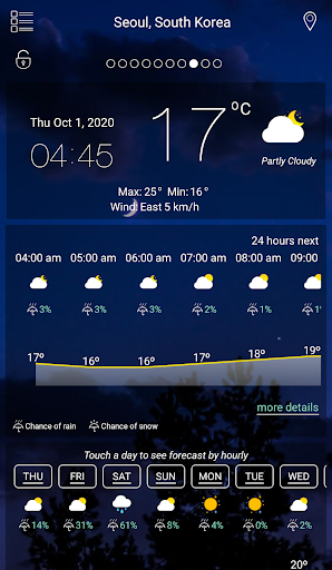 ◉ The weather radar provides you with accurate information about the current weather and has hourly, daily and weekly forecasts.