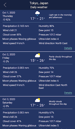 Everything about the daily weather is clear at a glance! Up-to-date detailed information on temperature, heat index, rain or snowfall, wind, sunshine, and the likelihood of storms. Detailed data on air pressure, humidity and UV index. Use the 7 days weather forecast feature to plan ahead.