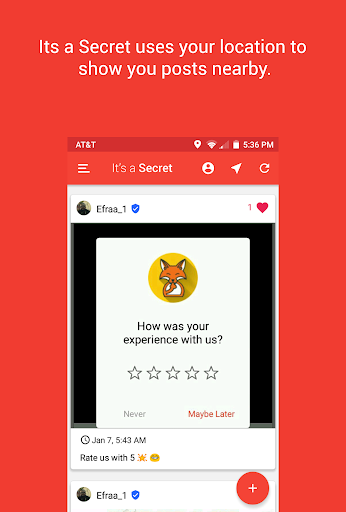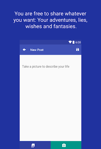 It's a Secret is an application that allows the user to share whatever you want: Your adventures, lies, wishes and fantasies. Secret lets you take a picture (or choose one from your gallery) and publish it on your wall. The application uses your location to show you nearby posts from other people around you.