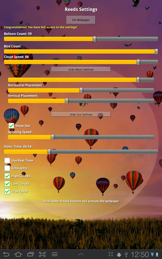 While the free version is beautiful and fully functional, most settings are locked. The full version is highly customizable and offers real time mode with seamless color transitions between all times of the day. You can also let the wallpaper autmatically calculate the correct sunrise and sunset times for your location to make the day/night cycle look as real as possible.