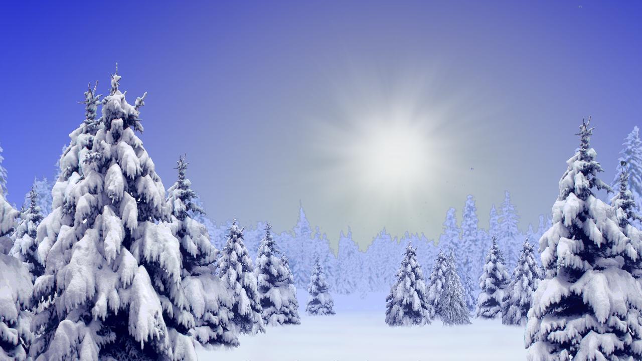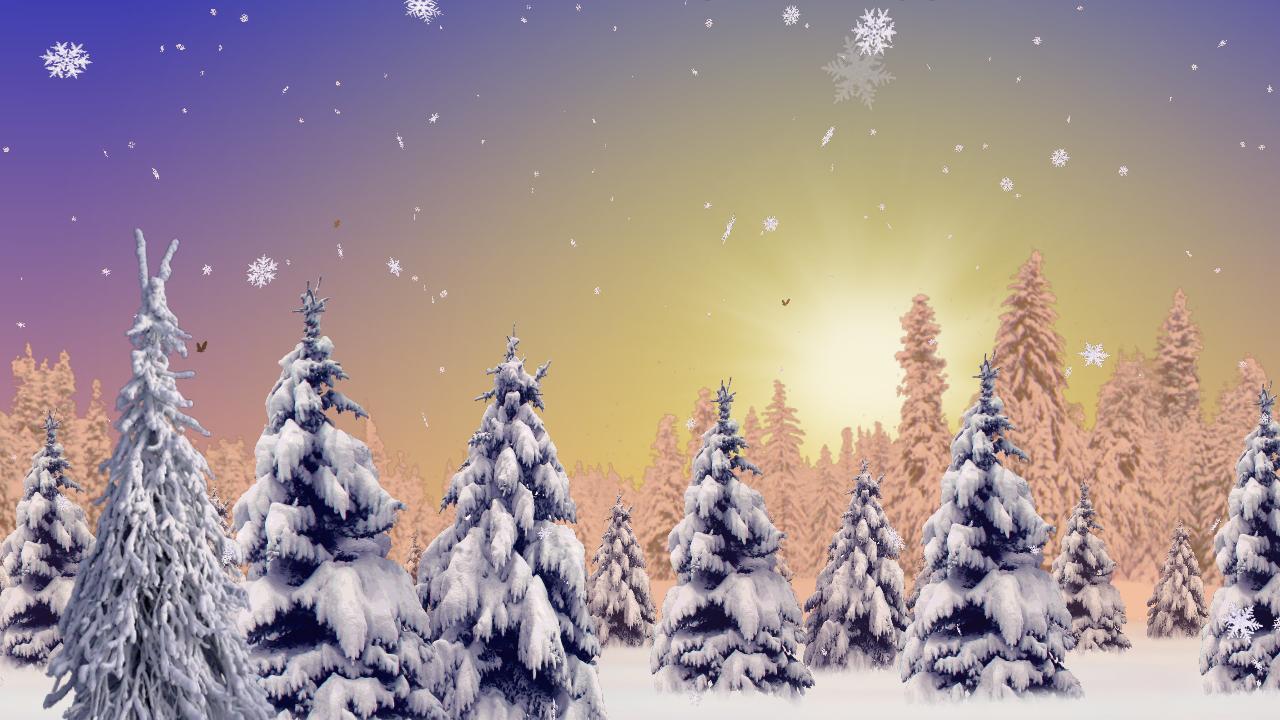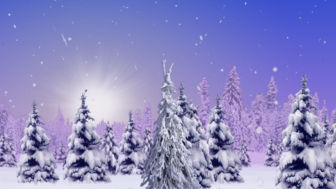 A wonderful landscape covered in pure white snow. Pine trees sway and snowflakes slowly fall from the sky.