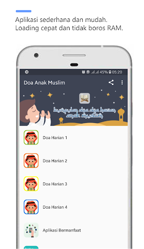 Pada Aplikasi ini tedapat beberapa kumpulan doa anak muslim, anak-anak muslim dapat belajar menghafal doa sehari-hari, doa anak muslim di sajikan dalam bentuk doa arab, doa latin dan juga terjemahnya sehingga anak muslim dapat belajar doa sehari-hari dengan lengkap. Aplikasi Berdoa Anak Muslim ini lengkap dengan suara dan gambar yang menarik yang disertai pula dengan doa berbahasa arab dan Indonesia.