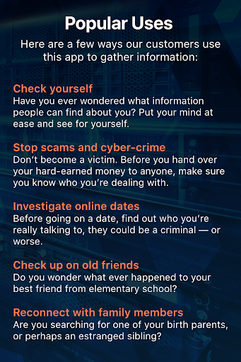 Download to investigate your neighbors, verify a date’s background, find a phone number’s owner, and more—all at the touch of a button.