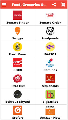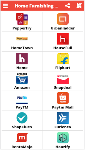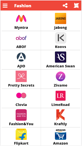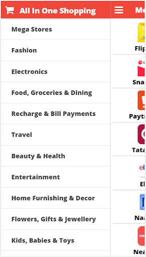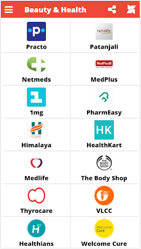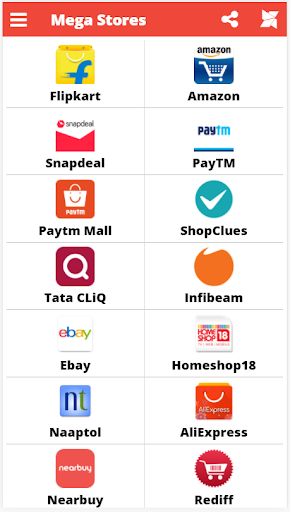 The all in one online shopping app supports 500 online stores in India such as Flipkart, Amazon, Snapdeal, PayTM, Paytm Mall, ShopClues, Tata CLiQ, Infibeam, Ebay, Homeshop18, Naaptol, AliExpress, Nearbuy, Rediff, Myntra, Jabong, ABOF, Koovs, AJIO, American Swan, Pretty Secrets, Zivame, Clovia, LimeRoad, Fashion&You, Kraftly, Jockey, Adidas, 20Dresses, Bata, Beardo, Bewakoof, Biba, Boltt, Chumbak, DailyObjects, FabAlley, Fabindia, Lifestyle, Indiarush, Nike, Nykaa, Shoppers Stop, Voonik, NNNOW, H&M, Zara, Croma, HP Shopping, Lenovo, ShopCJ, Zomato, Swiggy, Foodpanda, FreshMenu, FAASOS, BOX8, Dominos, Pizza Hut, McDonalds, Behrouz Biryani, Bigbasket, Grofers, Amazon Now, Nature's Basket, Spencers, Patanjali, ZopNow, KFC, Chaipoint, Mobikwik, FreeCharge, PhonePe, Oxigen, JioMoney, Airtel, Vodafone, Idea, BSNL, Aircel, Docomo, Ola Cabs, Uber Cab, Yatra, MakeMyTrip, Goibibo, Ixigo, Cleartrip, Expedia, IRCTC, RedBus, AbhiBus, OYO, Trivago, FabHotels, Treebo, Booking, Hotels, Airbnb, TripAdvisor, Skyscanner, Cheapflights, AkbarTravels, Via, Practo, Patanjali, Netmeds, MedPlus, 1mg, PharmEasy, Himalaya, HealthKart, Medlife, The Body Shop, Thyrocare, VLCC, Healthians, Welcome Cure, BookMyShow, TicketNew, BigMovies, INOX, PVR Cinemas, SPI Cinemas, Justickets, Cinemax, Cinépolis, Fun Cinemas, E-Square Cinemas, Pepperfry, Urbanladder, HomeTown, HouseFull, Home, Furlenco, RentoMojo, Houzify, Houzz, Bluestone, CaratLane, Candere, 99jewels, Voylla, PNG Jewellers, IndianGiftsPortal, BookMyFlowers, Fernsnpetals, 1800Flowers, HappilyUnmarried, Printland, Printvenue, ZoomIn, Firstcry, Hopscotch, Glossaread, SapnaOnline, AmarChitraKatha, Decathlon, Cosco, CarWale, CarDekho, BikeWale, BikeDekho, ZigWheels, Droom, Autoportal, CarTrade, Gaadi, OBV, ECO, SparesHub, GenuineParts, Boodmo, Gomechanic, BYJU'S, Aakash iTutor, NCERT Books, NCERT Solutions, Toppr, AskIITians, Robomate , Khan Academy, Extramarks and many more.