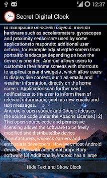 Scret Digital Clock is an application that allows the user to write or paste text and hide it behind a screen that shows the time . So Secret Digital Clock helps to hide the text without showing it to others. Secret Digital Clock is useful in school exams! With the simple excuse to keep your smartphone on the desk to watch the time , you can copy without getting caught by the teacher! But Secret Digital Clock can also be useful for other things....