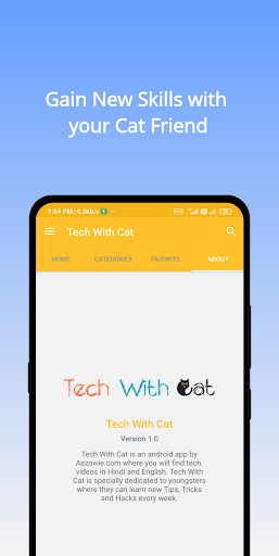 Tech With Cat is an android app by Aezowie.com where you will find tech. videos in Hindi and English. Tech With Cat is specially dedicated to youngsters where they can learn new Tips, Tricks and Hacks every week.