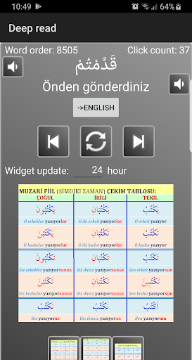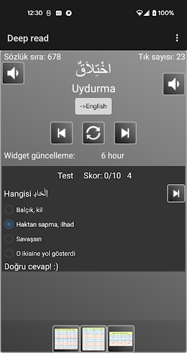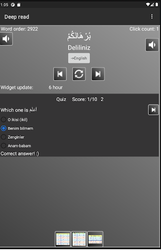 Deep Read is an application developed to facilitate better understanding of the word of God (Allah). The Arabic words from Quran are translated to English* and Turkish*. Widget, which can be placed on phone home screen, updates periodically and shows a random Arabic word. This allows user to guess the meaning, by clicking on the widget or the notification, user is opened the main app with the true translation.