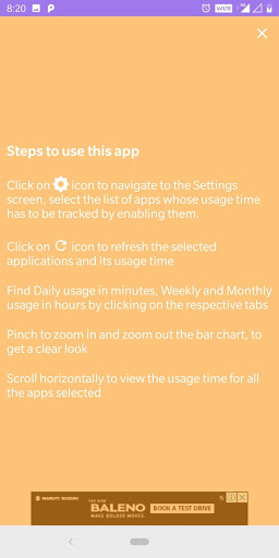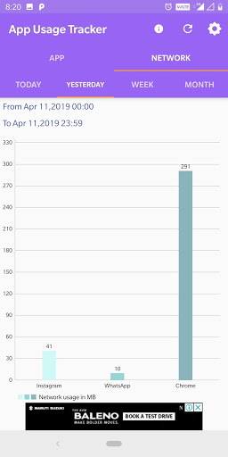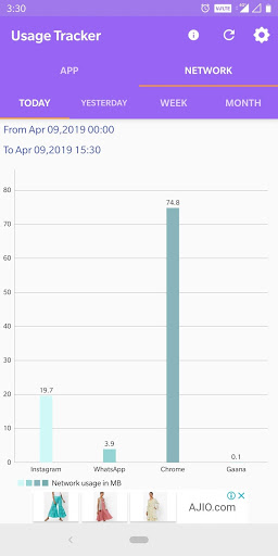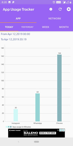 App Usage Tracker helps you view the amount of time spent and network used using each application installed in your device. Usage time information is shown in minutes for daily, yesterday and in hours for weekly, monthly usage. Network usage information is shown in MB for daily, yesterday and in GB for weekly, monthly usage.
