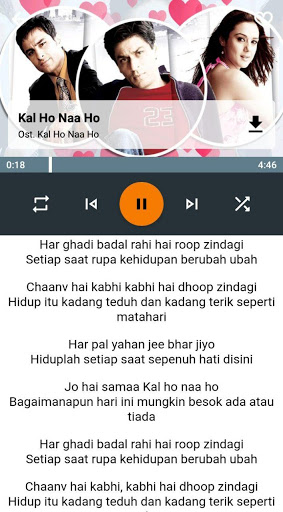 Aplikasi ini merupakan MP3 Musik Player yang berisi kumpulan lagu india dari Ost. Film India Kal Ho Naa Ho MP3 Offline lengkap dengan lirik lagu dan terjemah bahasa Indonesia.