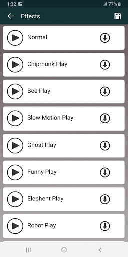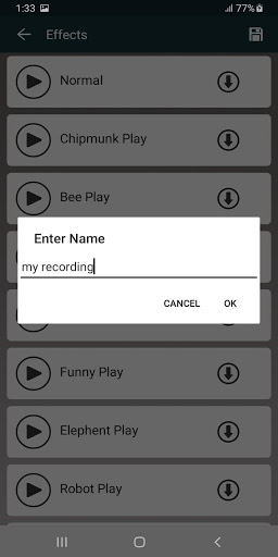 Sound and Voice changer is designed for entertainment purpose. Sound and Voice changer will record your voice or sound by clicking on record button and click again on record button to stop recording, and it will show you a list of different voices with name, click on play button of any voice in list to play your voice in different voice, and you can also download or save your recorded voice or sound in in that voice by clicking on download or save button.