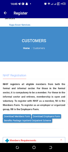Access NHIF Facilities in this app. Check my NHIF balance. Check my NHIF status online. Select a hospital for NHIF. Pay NHIF online.