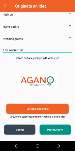 This application allows you to originate an idea, and set the industry, sector and the product in which your idea revolves. The other users of the application will be able to see your idea, they can comment on the idea, like or down vote it. The idea has a full description, in text, image or document attachments. People Who are interested in your idea can request to join your participator group, by giving reason why they want to join, the originator of the idea will receive a notification with that reason, ad can reject or deny a request, giving reason in the case of the latter. If a request is accepted, the both of you can communicate in a private group.