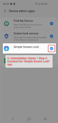 3.2.2.1. Go to “Settings” -> Click on the search icon or the “Search” button -> Type “Device admin apps” -> click on “Device admin apps” -> Unselect "Simple Screen Lock" -> Click "Deactivate".