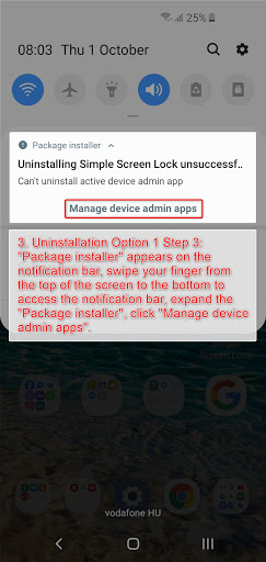 3.1.4. "Package installer" appears on the notification bar, swipe your finger from the top of the screen towards the bottom to access the notification bar, expand the "Package installer", click "Manage device admin apps".